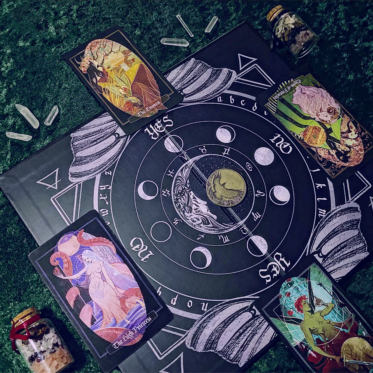 The only limits on our tools and practices are the ones we give them. These pendulum boards pair well with tarot cards, coin flips, and of course, pendulums! Want a yes or no tarot spread? How about a moon phase-based timing technique for your coin readings? This board can provide all that and more. The Luna Moth Pendulum Board is of premium quality with a classy linen finish. It folds in the center for portability and protection.