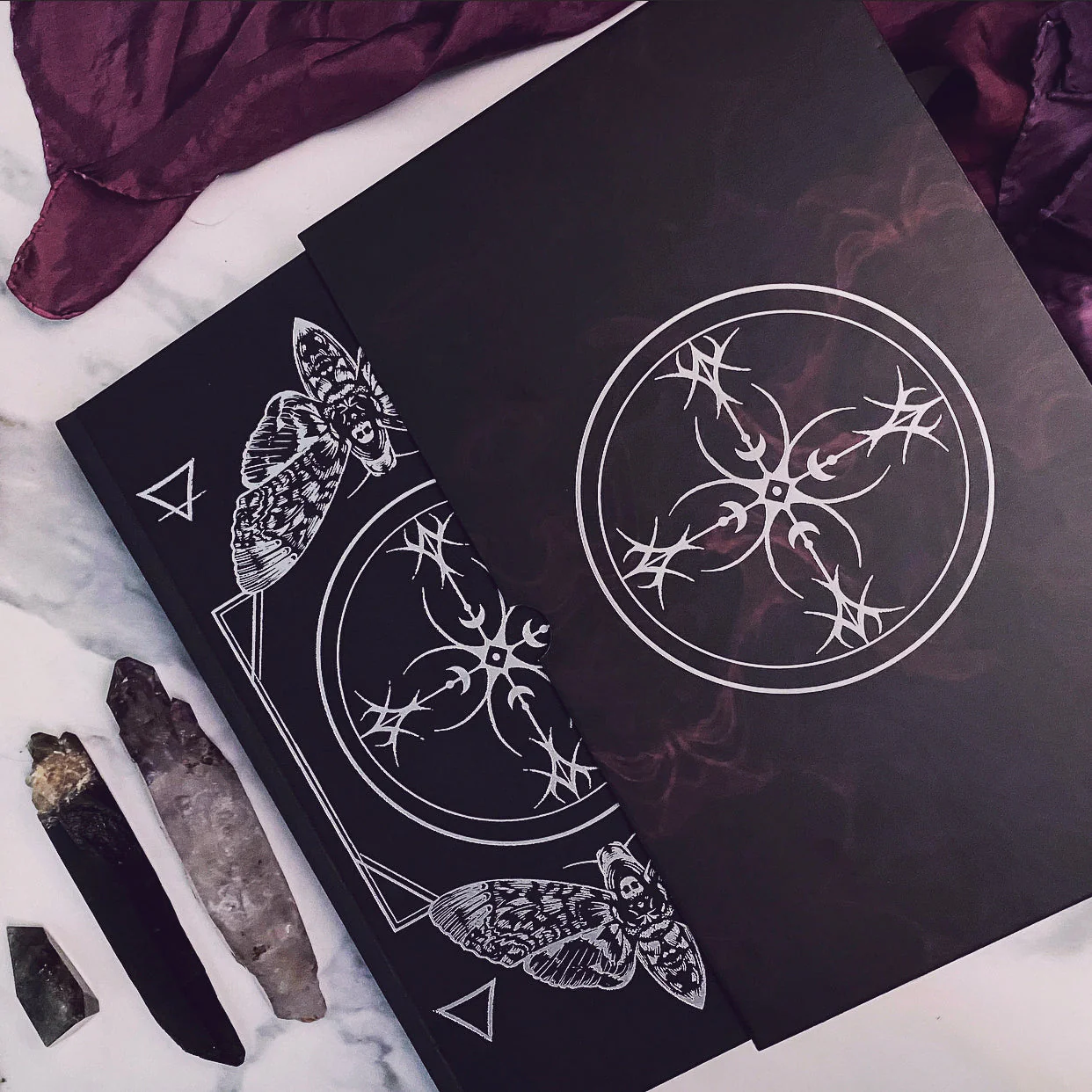 Hardcover, black linen finish with white gold foil sigil